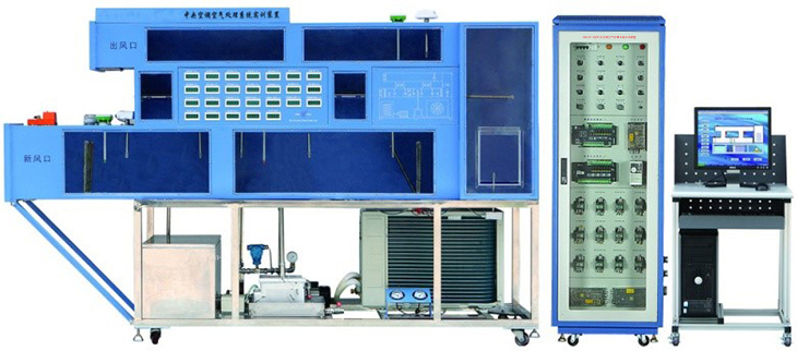中央空調系統(tǒng)由實驗臺、制冷機組、制熱系統(tǒng)、加濕裝置、空調箱(風道)、冷凍水系統(tǒng)、測量儀表(包括溫濕度傳感器及風速傳感器)、電氣控制系統(tǒng)、模擬熱源等組成。