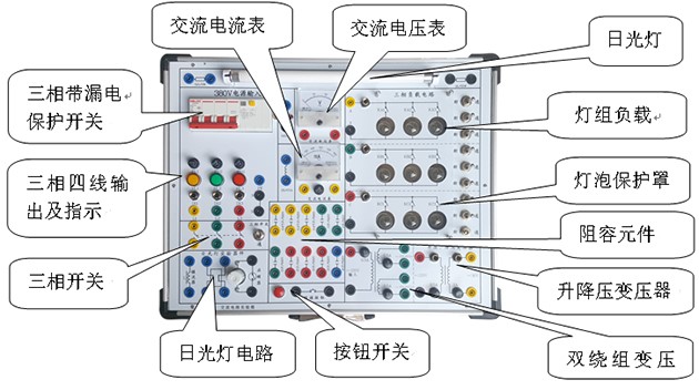4、配三相燈組負(fù)載:每相有三個(gè)15W燈泡,用3只開(kāi)關(guān)控制通斷,共9只燈泡。每相留有電流測(cè)量插孔1對(duì),便于相電流的測(cè)量。