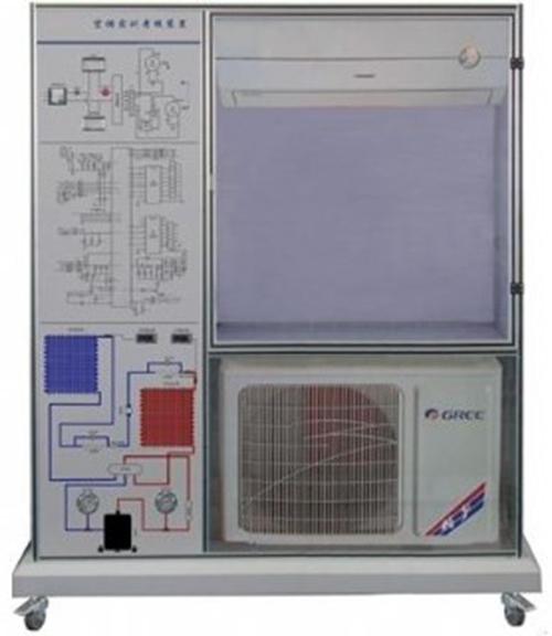 2.裝置直觀展示了變頻空調(diào)的系統(tǒng)結(jié)構(gòu)和工作原理,便于教學(xué)演示講解及學(xué)生對課本知識的理解掌握。配置的交流電壓表、交流電流表、溫度表、真空壓力表以及相應(yīng)的信號指示燈,使整個變頻空調(diào)系統(tǒng)的實時工作狀態(tài)一目了然;主面板中間印有電氣控制系統(tǒng)原理圖,并設(shè)有相應(yīng)測試點;屏背面可觀察到整個制冷系統(tǒng)結(jié)構(gòu)原理以及主要部件的實際物體,相應(yīng)部件均有名稱標識;并設(shè)有視液鏡,可觀察制冷劑狀態(tài)