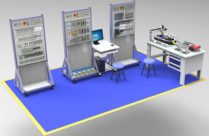 1.2平臺(tái)采用立式結(jié)構(gòu)開(kāi)放式設(shè)計(jì),主體采用 40*80 型材做骨架,周邊采用 Q235 冷扎鋼板做封板,表面靜電噴塑處理,整機(jī)既堅(jiān)固耐用,又美觀(guān)大方。底部裝有帶腳墊萬(wàn)向輪,萬(wàn)向輪移動(dòng)時(shí)用,可調(diào)腳固定時(shí)用,移動(dòng)固定兩相宜。頂部安裝電源模塊,中部為實(shí)訓(xùn)區(qū)域,依據(jù)任務(wù)安裝不同掛板。