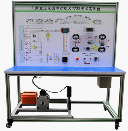檢測控制面板(裝有各種檢測端子,1448×940mm彩色電路圖和工作原理示意圖)、組合儀表、點火開關、電機控制器、車載充電器與充電接口、DC-DC轉(zhuǎn)換器、鋰動力電池組、電動車電機(永磁同步電機)、剎車開關、檔位開關、油門控制裝置、大電流繼電器、電源總開關、急停開關、輔助蓄電池(12V45AH)、一體化全鋁合金型材搭建的移動臺架(1500×700×1700mm (帶自鎖腳輪裝置,帶安裝檢測端子的原理面板,面板1448×940mm)、設備操作說明書。