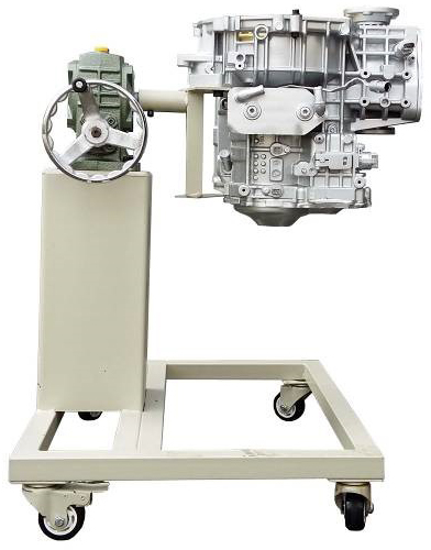 采用減速翻轉(zhuǎn)機(jī)構(gòu),可使變速器旋轉(zhuǎn)任意角度,并能任意位置鎖止,便于學(xué)生從不同的角度進(jìn)行拆卸和裝配。