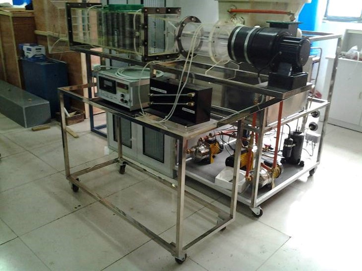 多翼式低噪音風機,自動調(diào)節(jié)風門,組合式有機玻璃風洞,翅片加熱管,加熱由固體調(diào)壓模塊配電位器調(diào)節(jié)加熱功率,數(shù)顯電流表、電壓表,翅片管簇順排和叉排組合,溫度傳感器,畢托管配差壓傳感器測量風量,16路萬能信號輸入巡檢儀顯示溫度、阻力、流量,不銹鋼支架。