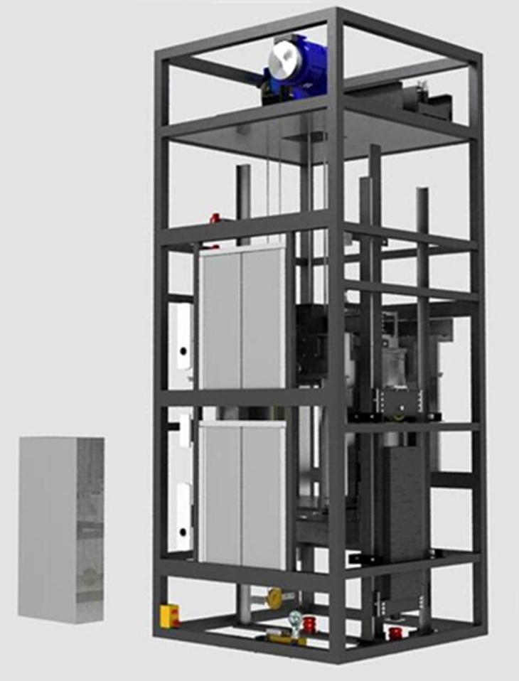 電梯機(jī)房實(shí)訓(xùn)裝置,模擬機(jī)房教學(xué)電梯(三層三站)包括架體,控制柜和電源柜,架體為雙層框架結(jié)構(gòu),架體上設(shè)置一個(gè)曳引機(jī)機(jī)座,曳引機(jī)機(jī)座上固定一個(gè)曳引機(jī),曳引機(jī)一側(cè)的架體上固定一個(gè)限速器,限速器上方設(shè)置一個(gè)盤車手輪和松閘扳手,盤車手輪和松閘扳手固定在墻體上,曳引機(jī)的對重從下方架體的兩個(gè)槽孔中穿過,限速器的對重也從下方架體的槽孔中穿過.本實(shí)用新型安裝于較大的空間內(nèi),結(jié)構(gòu)簡單,方便安裝和操作,可完美模擬電梯機(jī)房的安裝現(xiàn)場和模擬電梯應(yīng)急救援過程,并可結(jié)合土建圖紙學(xué)習(xí)機(jī)房的現(xiàn)場勘測,使學(xué)員及教員可以更好地觀察或安裝電梯機(jī)房內(nèi)的部件結(jié)構(gòu)和運(yùn)行狀態(tài),學(xué)習(xí)電梯應(yīng)急救援過程和土建勘測,方便了電梯機(jī)房的教學(xué),印象直觀而深刻,提高了機(jī)房實(shí)訓(xùn)效果.