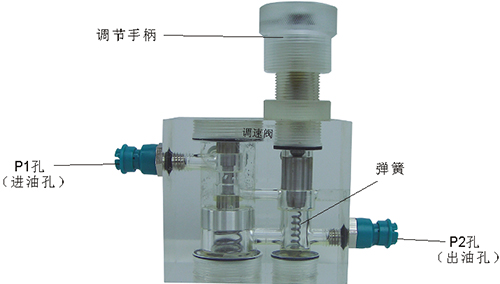2、溢流閥結(jié)構(gòu)上參考了國(guó)產(chǎn)P-63B型低壓直動(dòng)式溢流閥,其閥體閥蓋、鎖緊螺母、調(diào)節(jié)螺母、螺塞等采用了進(jìn)口透明有機(jī)玻璃材料精制而成,閥芯、調(diào)節(jié)桿采用了45#中碳鋼材料。并配合彈簧,油接頭,密封圈等標(biāo)準(zhǔn)件裝配而成,通過它可明確地觀察到閥芯、彈簧、油孔等結(jié)構(gòu)及其運(yùn)行過程,具有形象逼真,性能可靠等優(yōu)點(diǎn)。它即可作為教學(xué)模型,也可以作為液壓實(shí)驗(yàn)元件進(jìn)行實(shí)驗(yàn)演示。