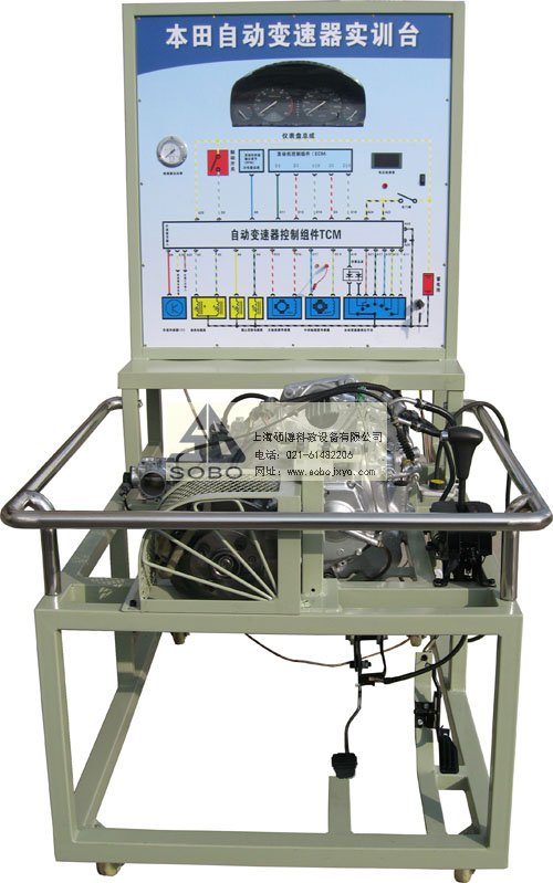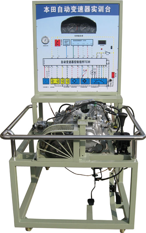 本自動變速器實訓臺是本公司采用日本本田公司自動變速器為適應汽車教學需求而研制的,該實訓臺由電控變速器(八成新)、操作顯示面板及發(fā)動機彩色電氣原理圖電腦控制柜、可移動式臺架(萬向腳輪)、驅(qū)動系統(tǒng)(腳踏式油門踏板)變頻電機驅(qū)動、剎車系統(tǒng)(腳踏液壓盤試剎車)、啟動系統(tǒng)(電門鎖方式啟動)、車速傳感器、電磁閥執(zhí)行器、原車電腦、具有發(fā)動機運轉(zhuǎn)及顯示(轉(zhuǎn)速.車速.檔位)、液壓油壓力顯示表(顯示換檔過程油壓)、自動變速器電磁閥工作指示LED燈、原車診斷座、進行失速實驗等、故障設置區(qū)可設置8路故障(老師設置任一路線路故障)、故障排除區(qū)(學生通過各種儀器、儀表、)在面板上用專用排故線連接排除故障、傳感器信號模擬等多項功能、具結構緊湊、操作方便、安全可靠、教學直觀、是汽車自動變速器實物教學不可缺少的實驗室設備之一。