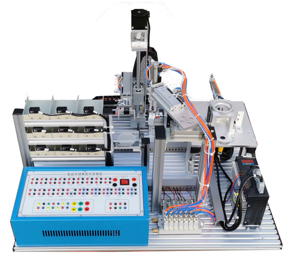 模型底板由10mm厚鋁板加工氧化而成,模型由堆垛機、立體倉庫、搬運機械手、稱重加料機構(gòu)、傳感器、氣缸等組成;所有機構(gòu)由有1.2mm優(yōu)質(zhì)鋼板加工噴涂制作或鋁材機加氧化而成,堅固耐用。該任務(wù)堆垛機有步進與伺服控制,負責(zé)物料的出入倉;機械手負責(zé)對物料的加料前后的搬運;稱重加料機構(gòu)對物料進行稱重及加料工作。同時為方便教學(xué),開發(fā)了全開放的任務(wù)接口盒,盒體由1.2mm優(yōu)質(zhì)鋼板加工噴涂制作,面板有鋁板噴涂蝕印沖孔而成,通過并口電纜與智能存儲任務(wù)模型連接,以迭插端子形式開放模型接口,方便實訓(xùn)教學(xué)。