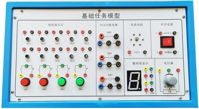 該任務(wù)盒有1.2mm優(yōu)質(zhì)鋼板加工噴涂制作,面板有鋁板加工沖孔而成,表面貼膜制作,配置有直流電機、7段數(shù)碼管、彩燈組、繼電器組、按鈕組、電位器等,能滿足對PLC教學(xué)基礎(chǔ)任務(wù)指令的學(xué)習(xí)與應(yīng)用。