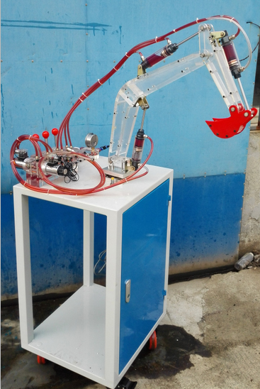實訓(xùn)臺主要由底柜,透明大臂,透明斗桿,透明挖斗(紅色),透明油缸,透明集成閥島,透明手動換向閥,透明電磁閥,旋缸馬達,減速器等成