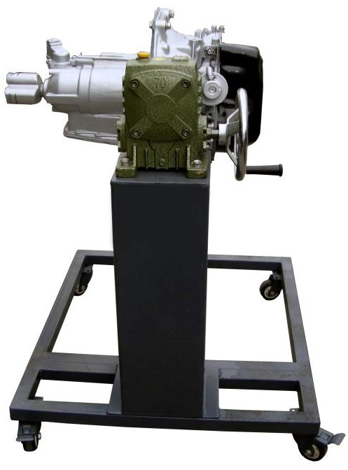 采用減速翻轉(zhuǎn)機(jī)構(gòu),可使變速器旋轉(zhuǎn)任意角度,并能任意位置鎖止,便于學(xué)生從不同的角度進(jìn)行拆卸和裝配。