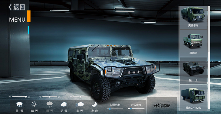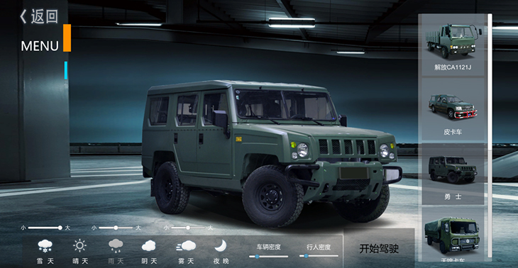 7.1、仿真車模型:10 種典型虛擬車輛模型:東風(fēng)猛士、北汽勇士、 EQ1118、EQ1121、 EQ2102、SX2150、SX2190、豪濼 ZZ2197、東風(fēng)天錦、大客車等,并可根據(jù)需要拓展、定制個(gè) 性化車輛模型。