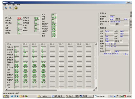 中央空調機由于工程復雜,設備分散,有的已經(jīng)裝修在開花板上測試程序,一但出現(xiàn)了故障,工程量相當大,為了能夠快速準確地測出故障是由主機機組還是室內機的故障的,每個生產(chǎn)廠家根據(jù)生產(chǎn)的和維修的需要而開發(fā)了中央空調測試程序?蓽y試壓縮機的運轉頻率,傳感器的各種數(shù)據(jù),電子膨脹閥的工作步數(shù)等幾十種中央空調的工作數(shù)據(jù)和狀態(tài),軟件可實現(xiàn)對內機的控制,,可以對1-64臺內機的狀態(tài)進行設定。是高校提供了好的研究的學習設備。